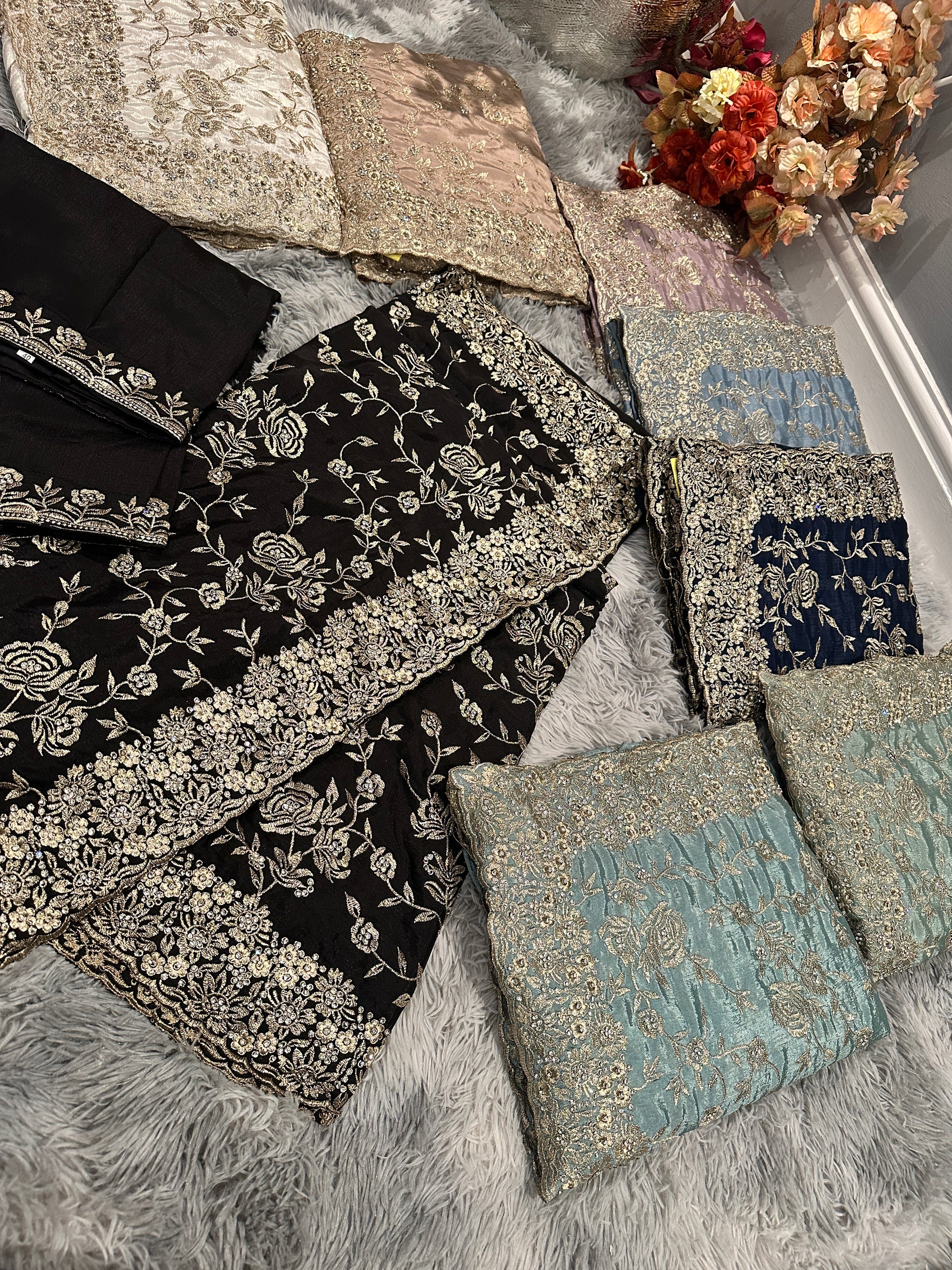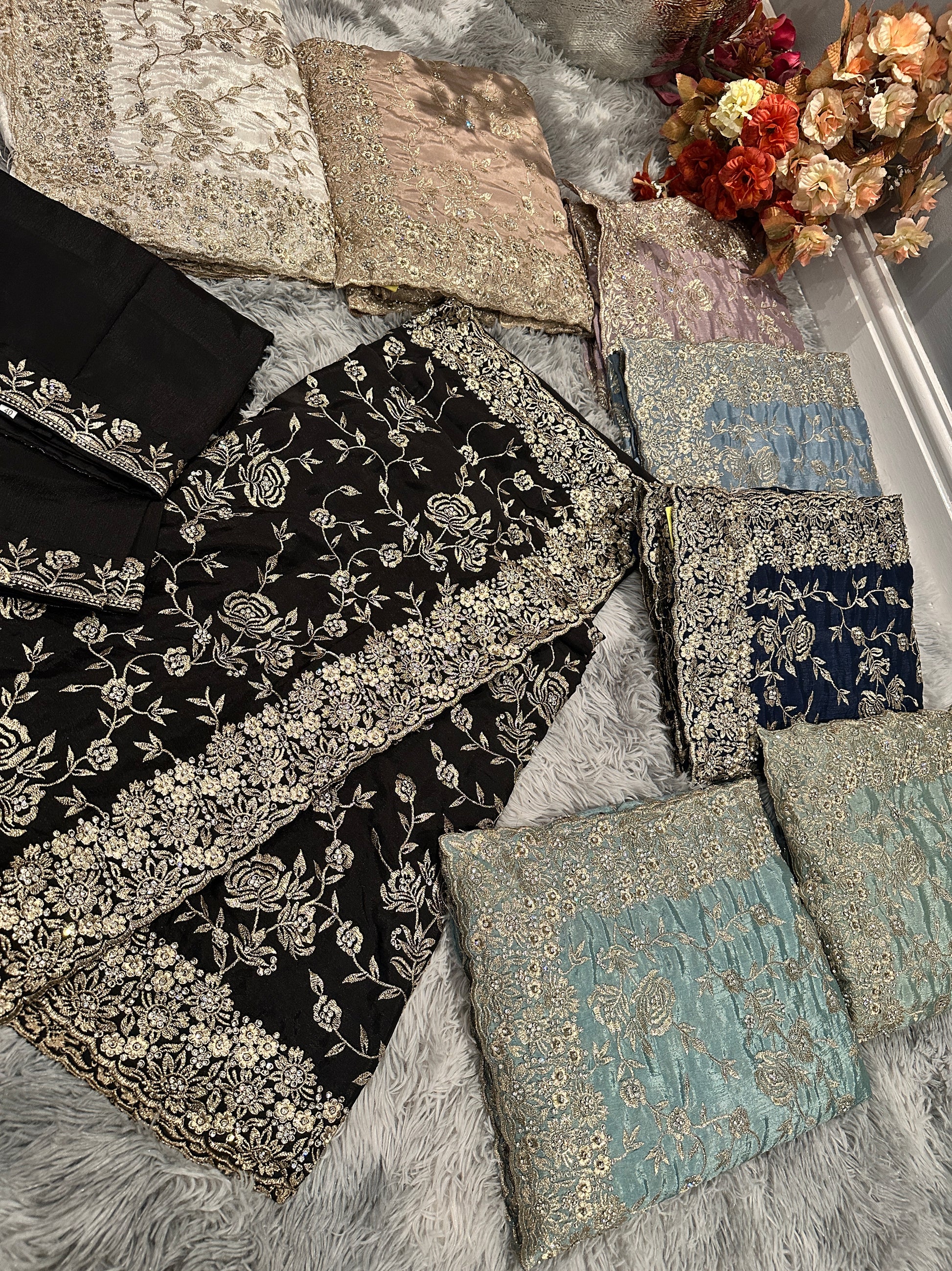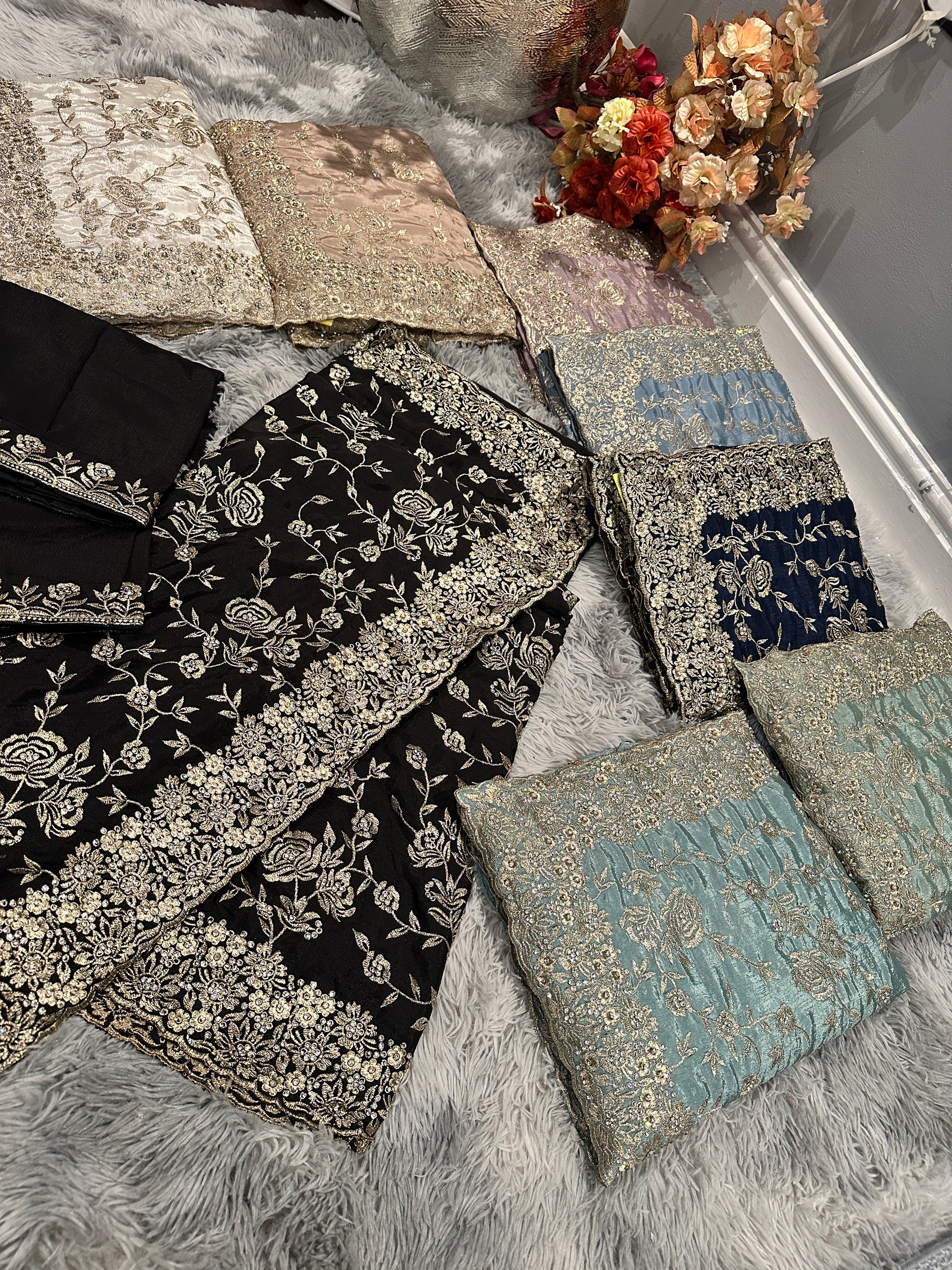 This stylish gold work saree boasts intricate gold thread work and stunning stone accents, making it a perfect choice for any special occasion. The elegant design is complemented by a ready made blouse, providing convenience and effortless style. Elevate your wardrobe with this stunning and timeless piece.